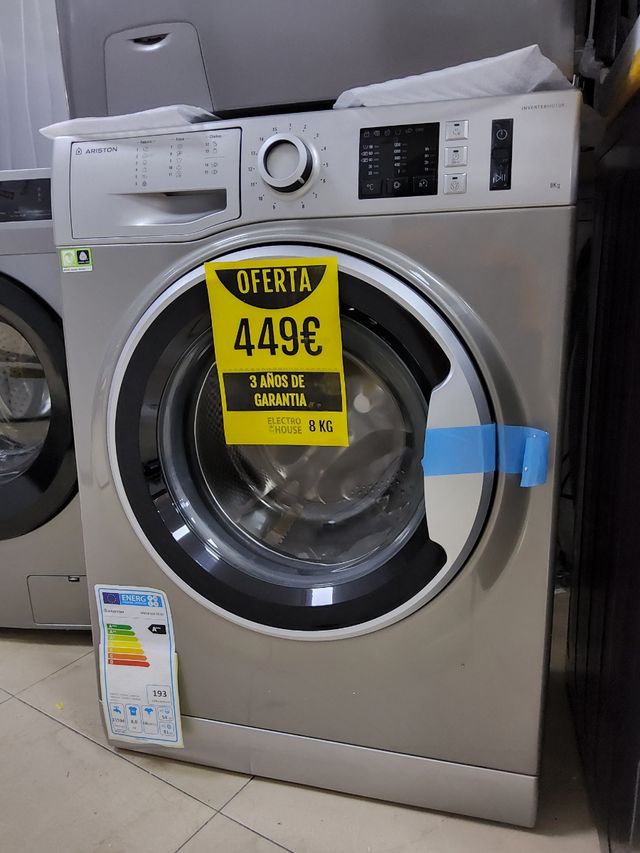 Detalles del productoLavadora Ariston NM10 823 SS EX de 8kg. Es de color gris plata y tiene un diseño elegante.