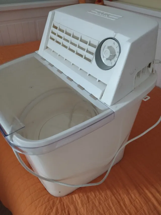 Lavadora portátil de camping de la marca Jata. Ideal para viajes o espacios reducidos. - Diseño compacto y ligero. - Color blanco.