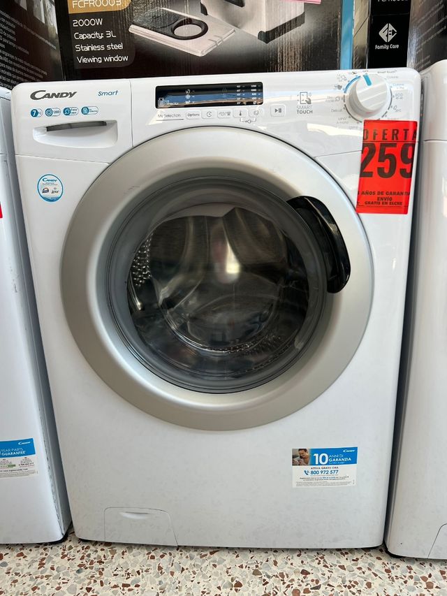 Detalles del productoLavadora Candy smart de 7kg, prácticamente nueva, con pequeña tara estética. Ideal para quien busca una lavadora eficiente a buen precio.