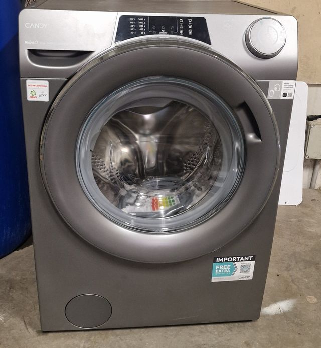 Detalles del productoLavadora Candy de carga frontal en color gris.