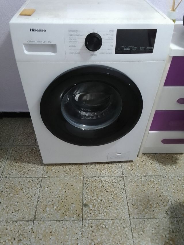 Detalles del productoLavadora Hisense de carga frontal con capacidad de 7 kg y tecnología Steam Allergy Care.