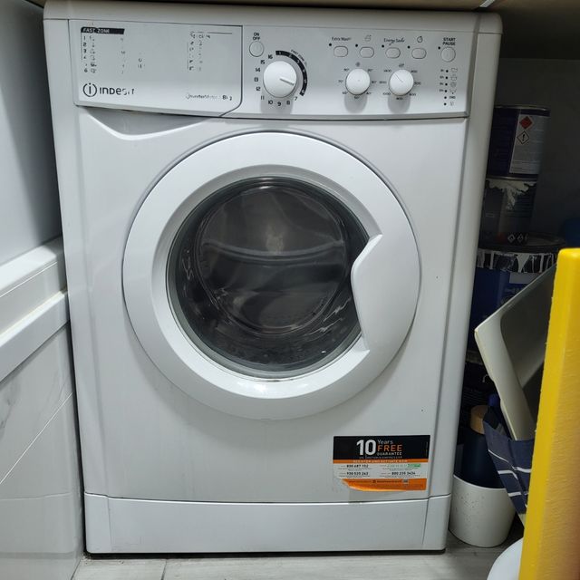 Detalles del productoLavadora blanca de carga frontal Indesit.