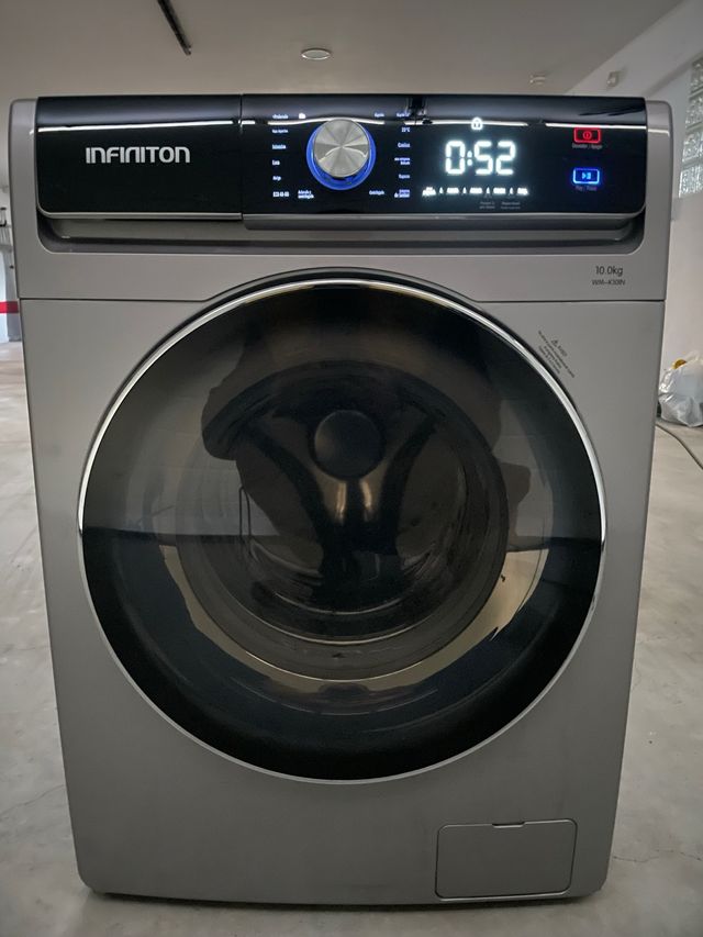 Detalles del productoLavadora INFINITON de carga frontal con capacidad de 10 kg. Su diseño moderno en color gris se adapta a cualquier espacio.