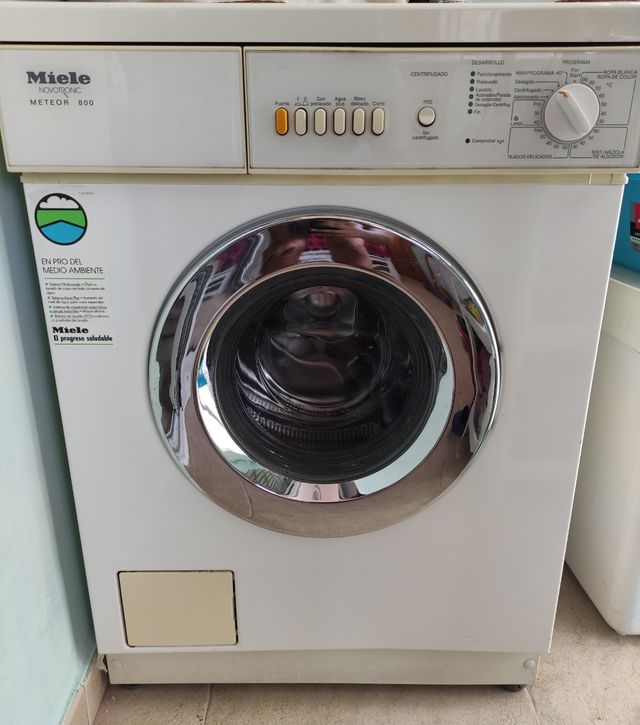 Detalles del productoLavadora Miele Meteor 800 en buen estado. Es una lavadora de carga frontal, de color blanco, con detalles cromados.