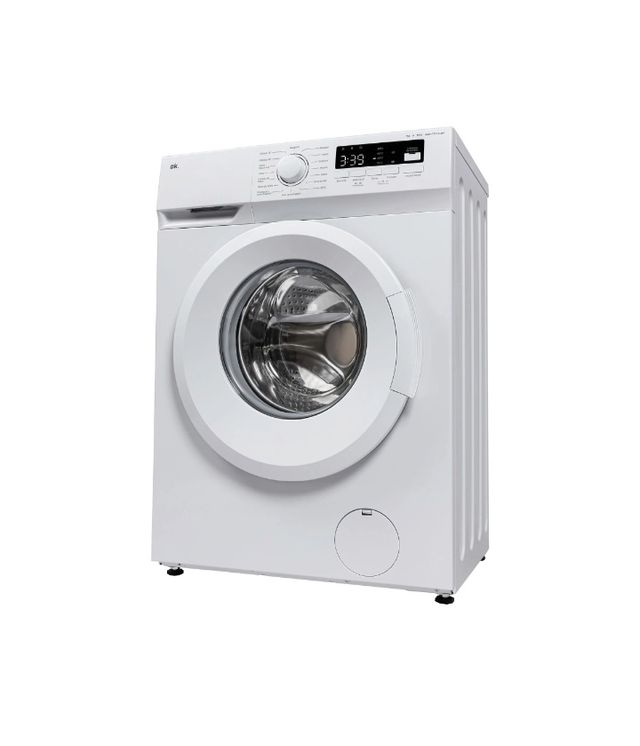 Detalles del productoLavadora de carga frontal en color blanco. Cuenta con un panel de control digital y selector de programas.
