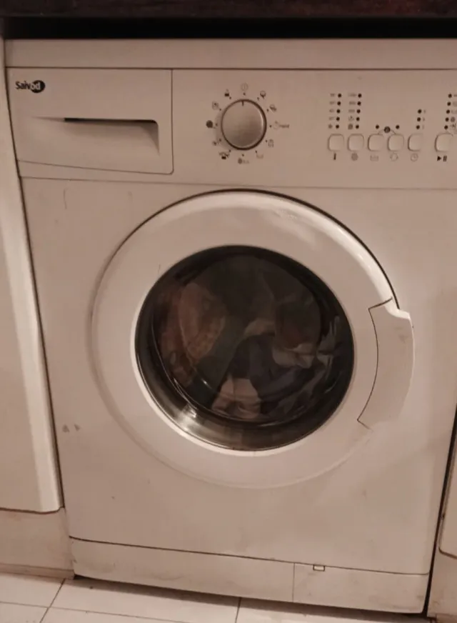 Lavadora de carga frontal marca Saivod. Diseño blanco. Panel de control con selector de programas y botones. Puerta redonda con cristal. Venir a recoger. Hay ascensor.