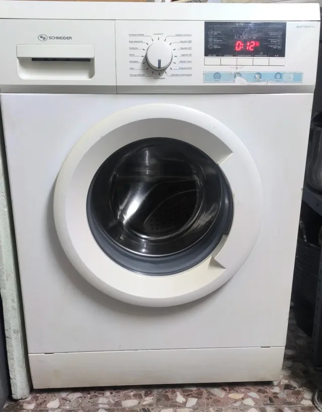 Detalles del productoLavadora de carga frontal marca Schneider con capacidad de 7 kg y clasificación energética A+++.