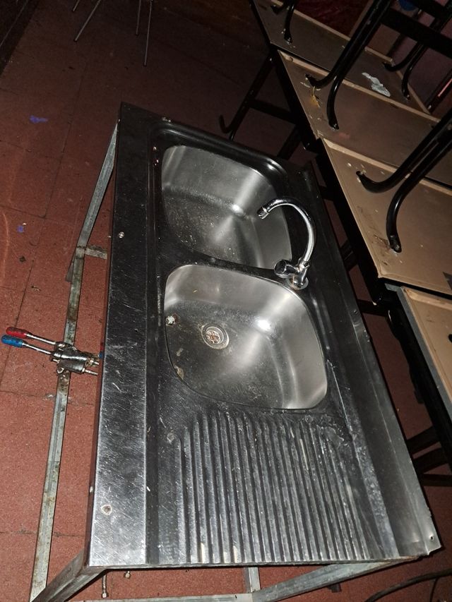 Detalles del productoLavaplatos de acero inoxidable de dos senos. Está en buenas condiciones, aunque presenta algunas marcas de uso.