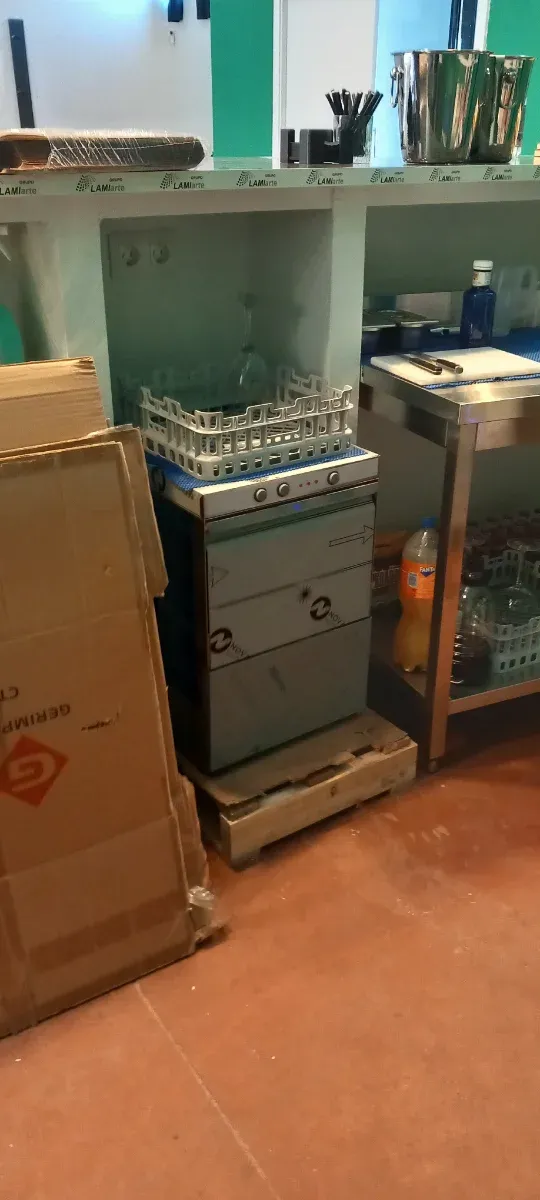 Lavavajillas profesional de acero inoxidable. - Diseño compacto y robusto. - Panel de control frontal. - Cesta superior para vajilla.