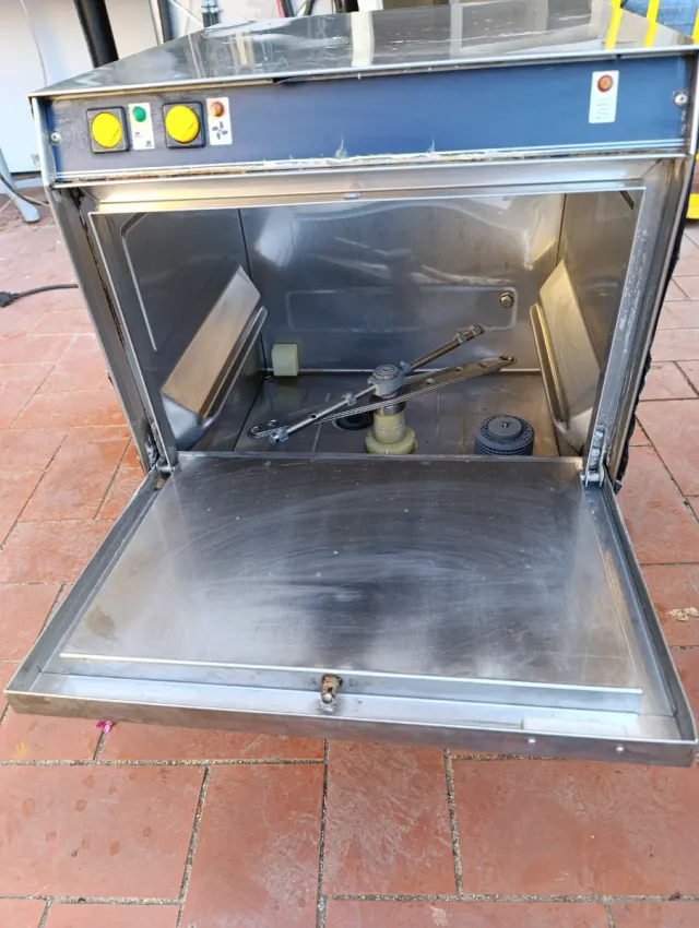 Detalles del productoLavavajillas profesional de acero inoxidable, ideal para negocios de hostelería.