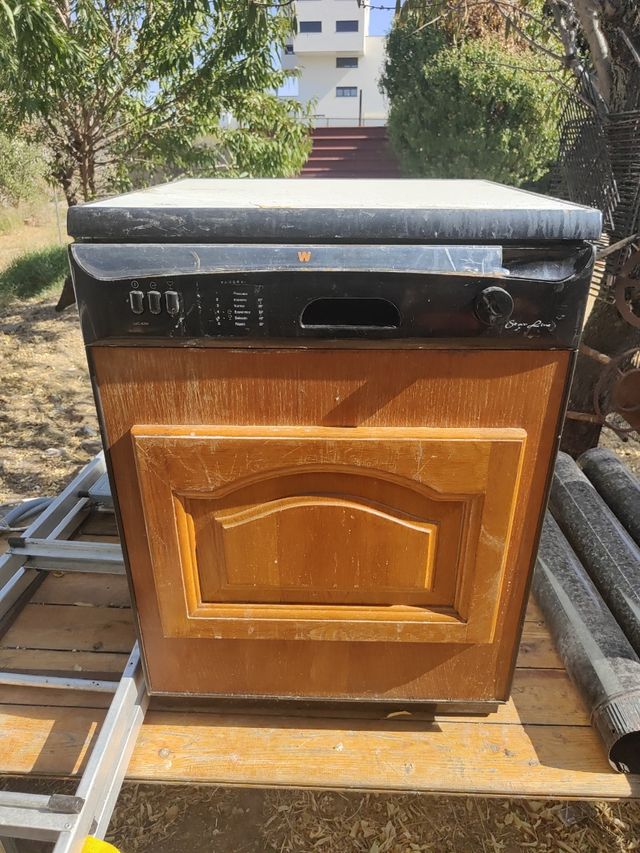 Lavavajillas de la marca Whirpool con frontal de madera. Está sucio con alguna marca de uso - Panel de control con programas. - Tirador integrado. - Diseño clásico.