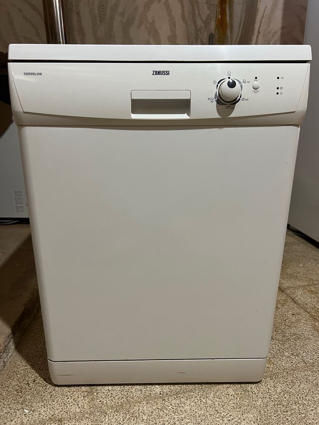 Detalles del productoLavavajillas blanco de la marca Zanussi, modelo Tempoline. Cuenta con un panel de control con selector de programas y luces indicadoras.