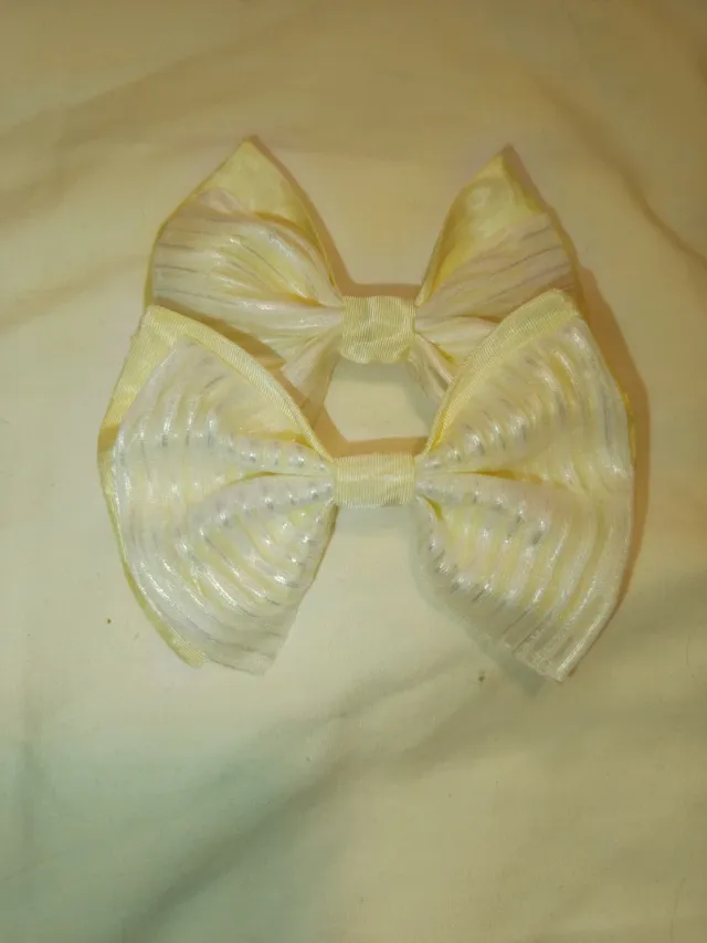 Este lazo de pelo es un accesorio encantador. - Color amarillo pálido. - Diseño con finas rayas plateadas. - Tejido brillante y ligero.