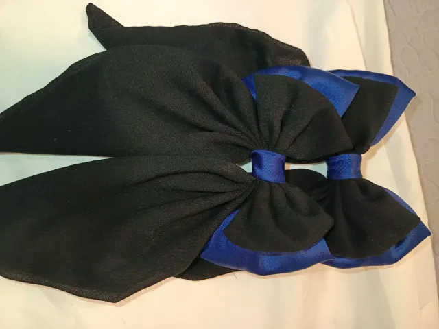 Detalles del productoEste lazo de pelo combina tela negra con detalles en azul vibrante. Es un accesorio llamativo y elegante.