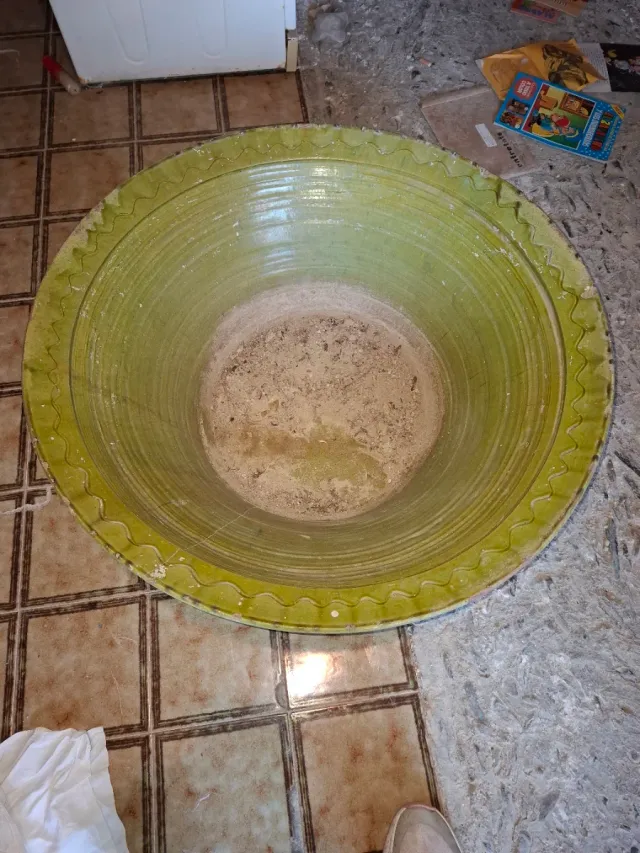 Detalles del productoGran lebrillo antiguo de barro con vidriado verde.