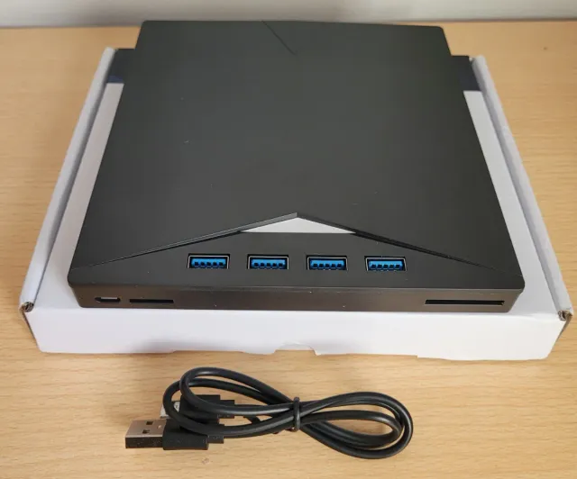 Dispositivo portátil con múltiples puertos USB y lector de tarjetas SD.