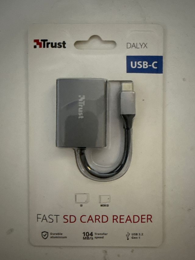 Detalles del productoLector de tarjetas SD de la marca Trust, con conexión USB-C. Está en perfecto estado.