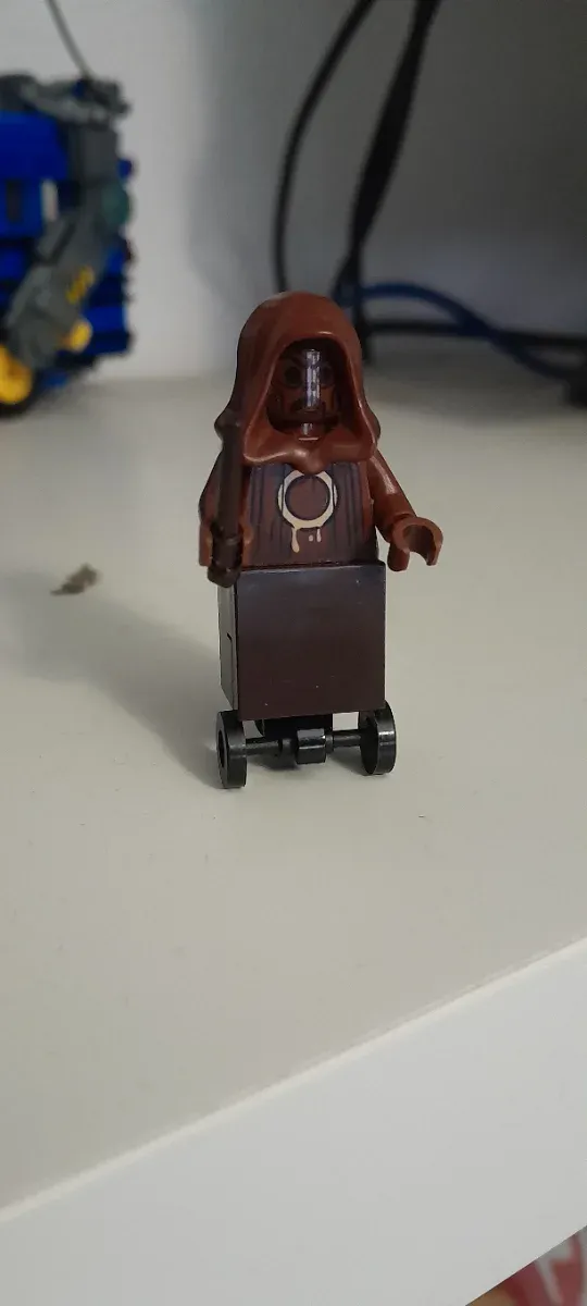 Figura de Lego del personaje de entrenamiento de Harry Potter. - Figura con túnica marrón y capucha. - Base con ruedas.