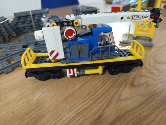 Vagón grúa de Lego del set 60198. - Vagón con plataforma. - Grúa con brazo extensible. - Ruedas para vías de tren.