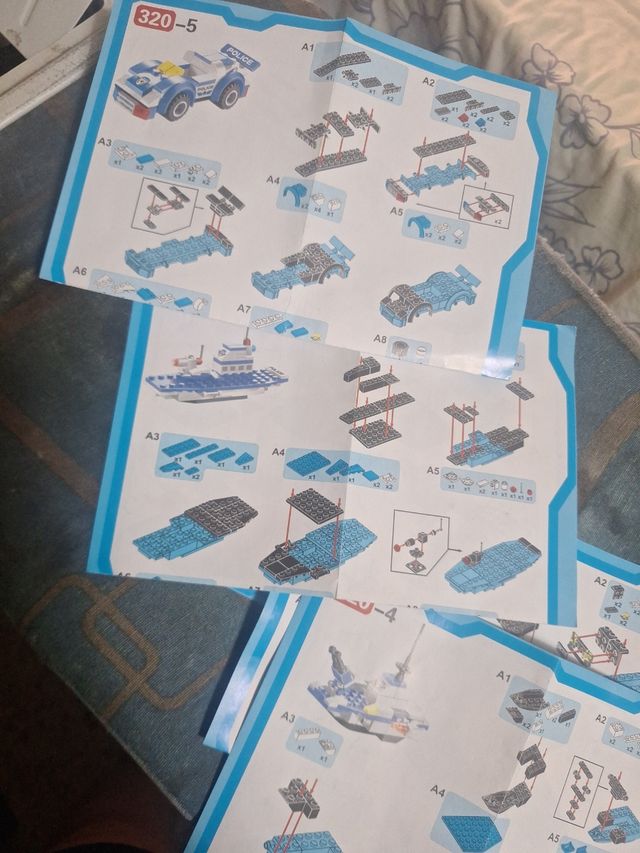 Detalles del productoInstrucciones de construcción para dos vehículos: coche de policía y barco. Las instrucciones están en buen estado, listas para usar.