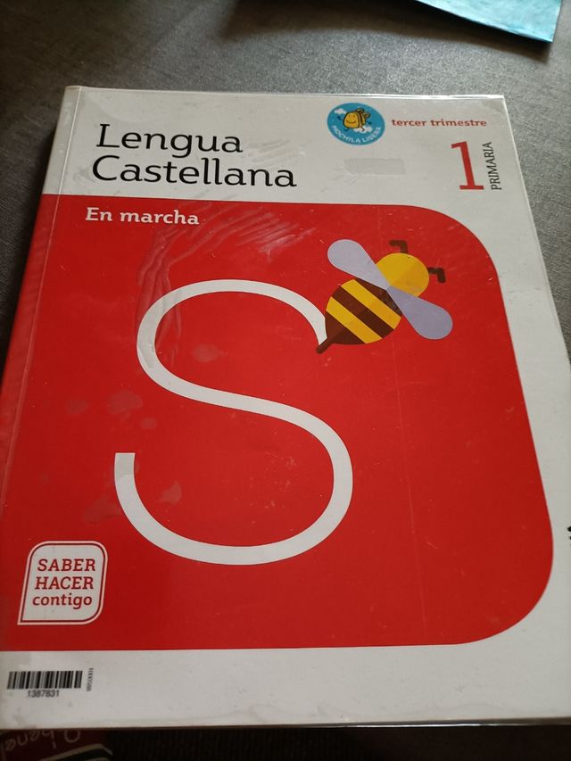 libro lengua castellana, tercer trimestre. Primero de primaria en marcha editorial Santillana. Escrito a lápiz. Para borrar.