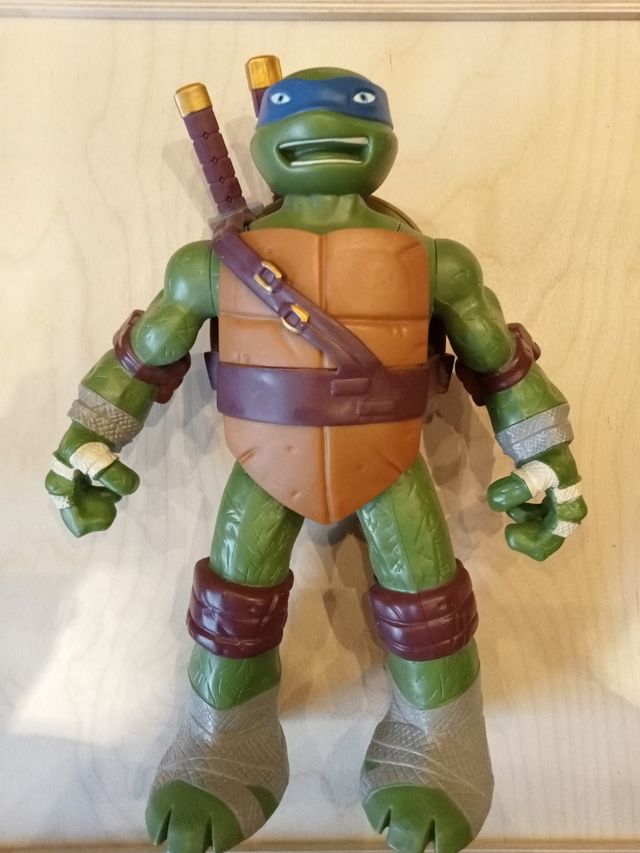 Figura Tortuga Ninja articulada: escondes la cabeza manualmente y al juntar las piernas la eleva de golpe. 2 espadas. Unos 26cn