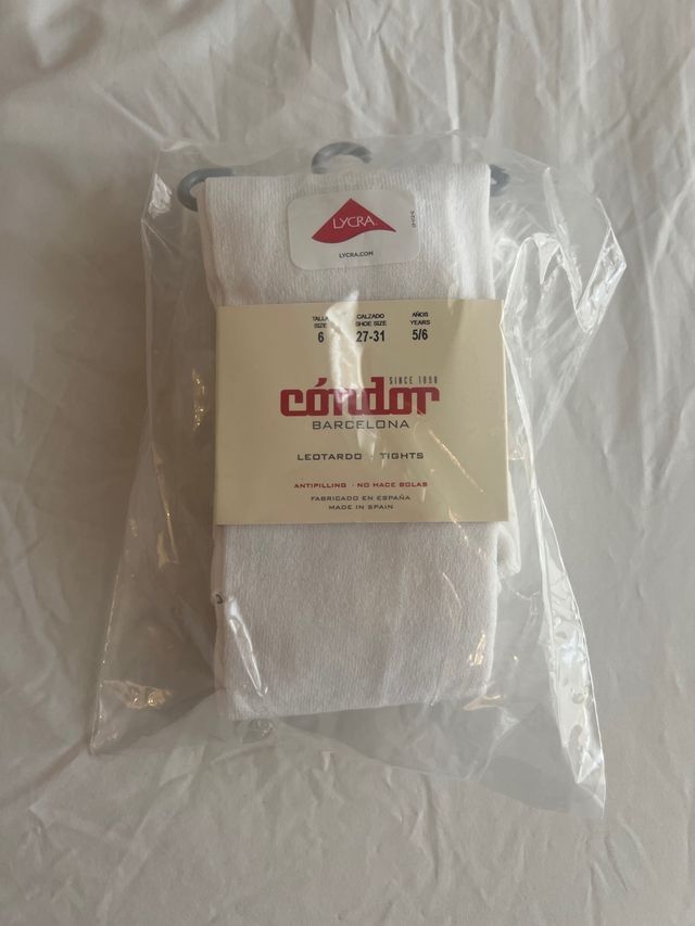 Detalles del productoLeotardos blancos Cóndor de Barcelona para niñas. Son de talla 5/6, y corresponden a un calzado de 27-31. Están nuevos, sin usar, y vienen en su paquete original.