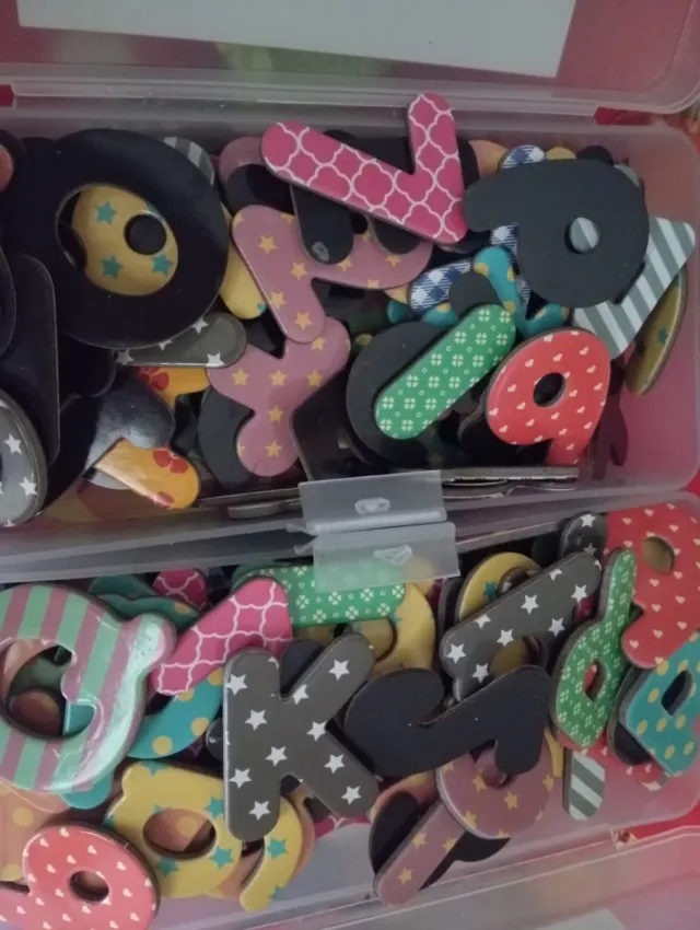 Set de letras y números magnéticos con diseños variados y coloridos.