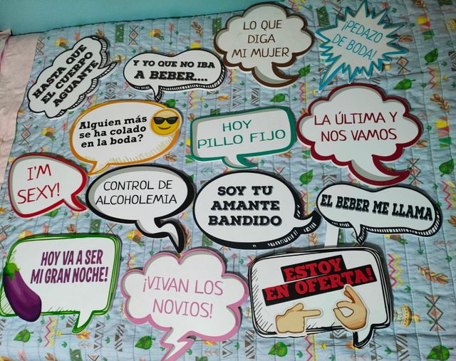 Detalles del productoPack de 14 divertidos letreros para photocall de boda. Ideales para crear recuerdos inolvidables. Son resistentes y están en perfecto estado.