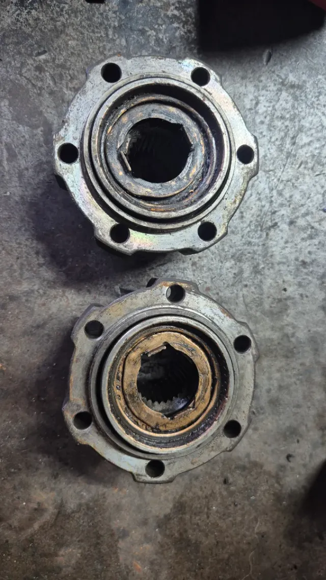 Detalles del productoPar de liberadores de rueda para vehículos 4x4. Piezas metálicas con estrías internas para acoplamiento.