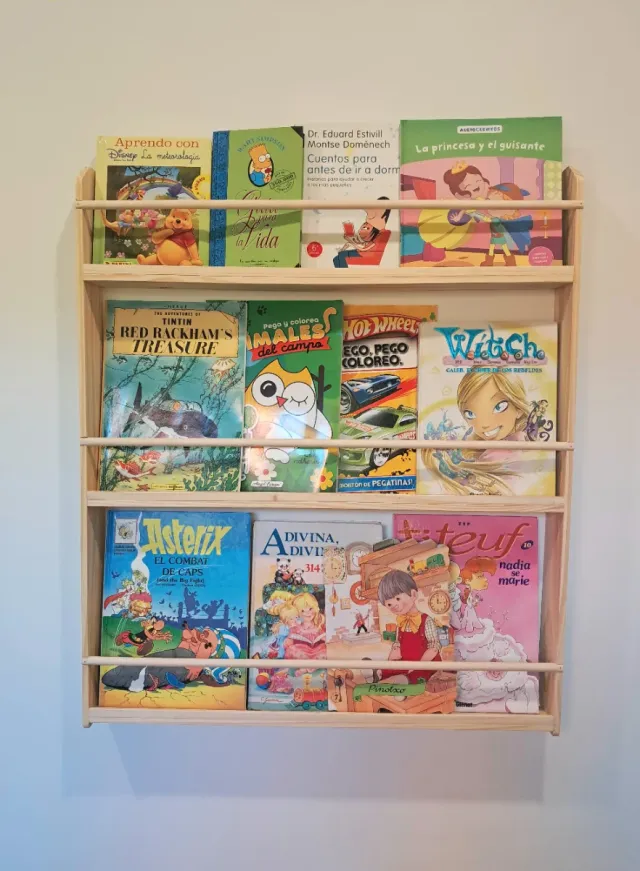 Estantería para cuentos de bebé, hecha con listones finos de madera natural. Ideal por su poco peso y resistencia. Con varillas redondas. Alto 82 Ancho 70 Fondo 8