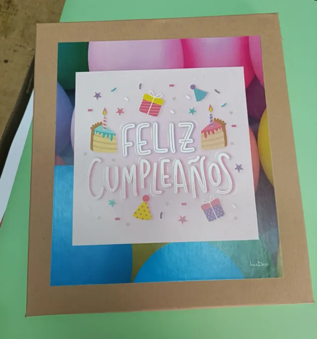 Con bolígrafo y caja de cartón, personalizada también de cumpleaños.
