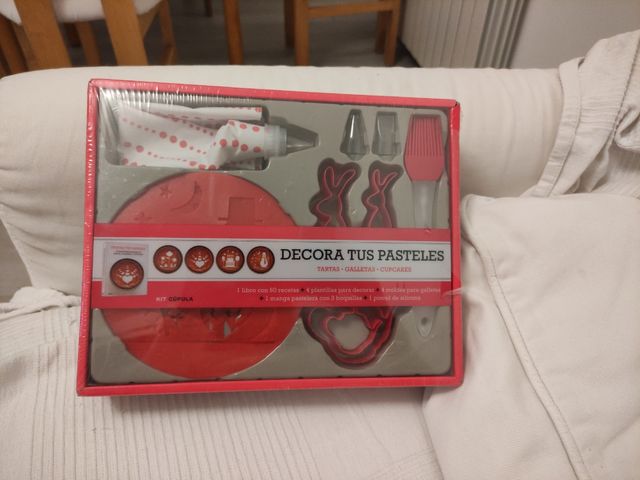 Detalles del productoLibro con 60 recetas para tartas, galletas, cupcakes..., 4 plantillas para decorar, cumpleaños, navidad... 4 moldes para galletas, tetera y conejitos, 1 manga pastelera con 3 boquillas, 1 pincel silicona. Caja precintada, todo nuevo a estrenar. Ed. Cúpula