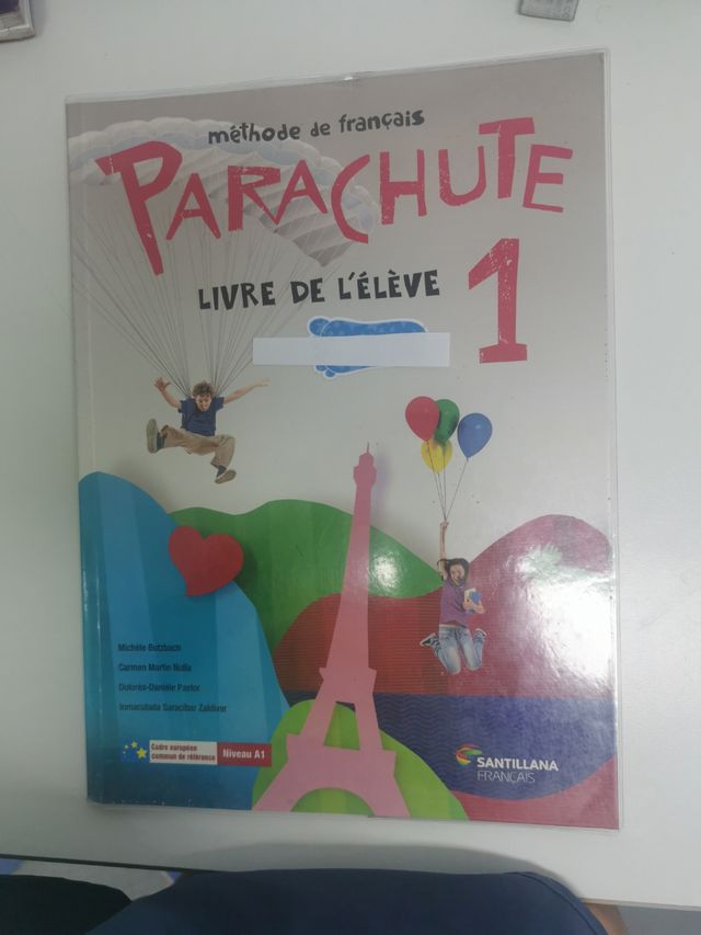Libro de texto primero de ESO de francés Parachute 1. Editorial Santillana. ISBN : 978-84-96597-97-6. Libro de prácticas no ofertado por estar escrito.