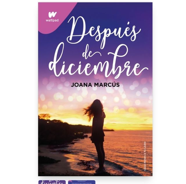 Novela Después de diciembre de Joana Marcús. - Portada con diseño de atardecer y silueta. - Título en tipografía manuscrita.
