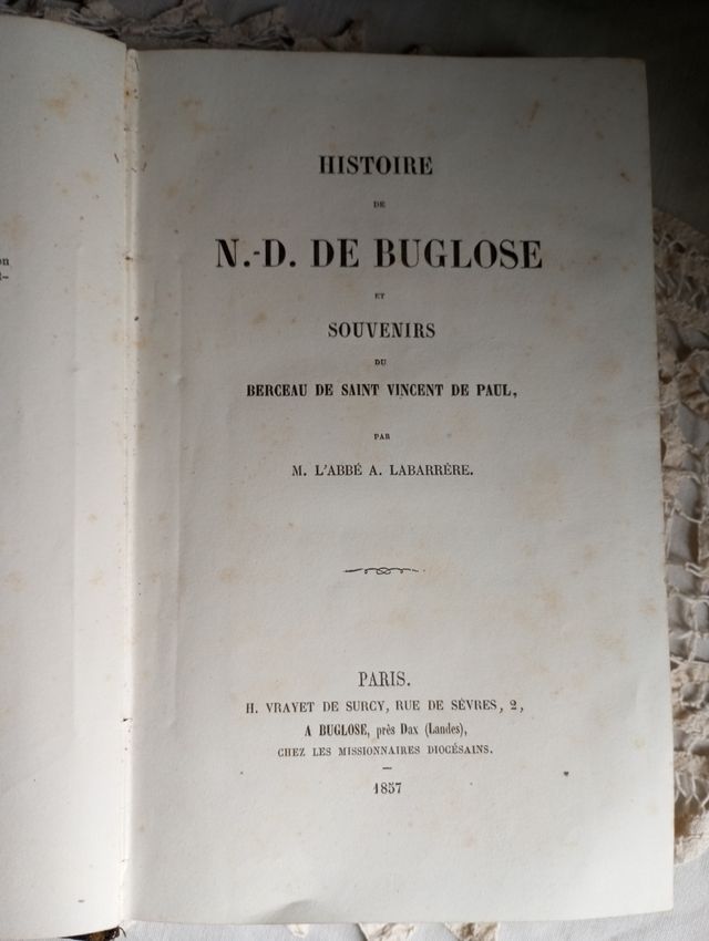 Detalles del producto"Histoire de Notre-Dame de Buglose", Berceau de Saint Vicent de Paul (París 1857). Bien conservado pese a su antigüedad  Medidas del producto