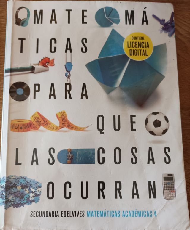 Libro de matemáticas académicas, (Para que las cosas ocurran) 4°ESO, edelvives. Está forrado y borrado. ISBN: 978-84-140-3490-3