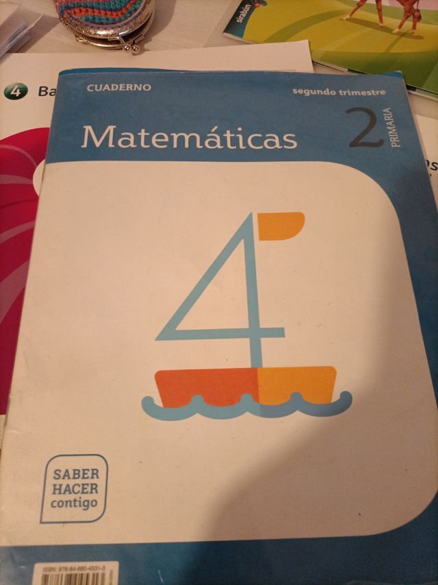libro y cuaderno de matemáticas segundo trimestre segundo de primaria de Santillana escrito a lápiz
