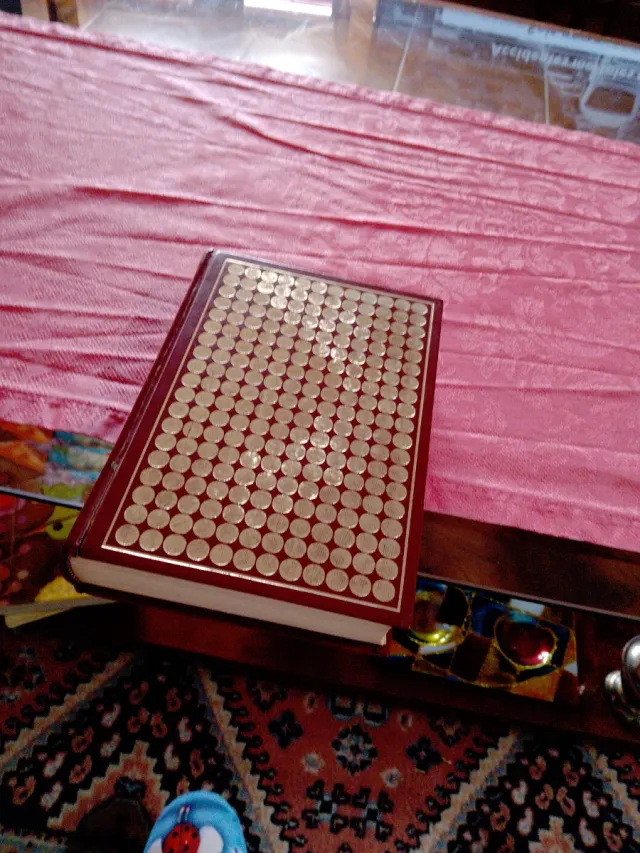 Libro con cubierta de tapa dura y diseño decorativo. - Cubierta de color burdeos. - Diseño de círculos dorados en relieve.