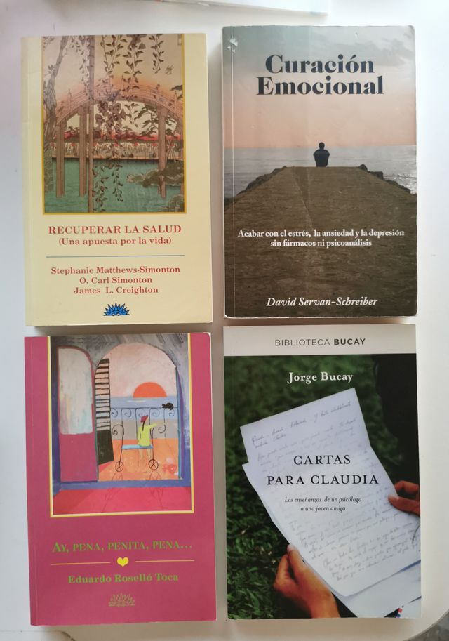 Detalles del productoCartas para Claudia. Jorge Bucay 2€ / Curación emocional. David Sevan-Schreiber 2 / Ay, pena, penita, pena. Eduardo Roselló Toca 18€ / Recuperar la salud (una apuesta por la vida) Stephanie Matthews-Simoton y otros. Los libros del comienzo. 8€. // PEDIDO MÍNIMO 9€ Puedes buscar LIBROSLV para hacer lote con los libros que te interesen (novela, ensayo, infantiles, antiguos,...) y ahorrar gastos de envío.