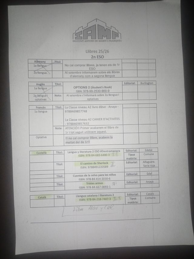 Libros de catalán, castellano, matemáticas, geografía, tecnología, música y francés de 2n de la eso