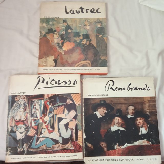 Detalles del producto3€ cada uno. 8€ por los tres. Libros de Pintores famosos, en inglés. Lautrec, Picasso y Rembrandt. Spring Art Books, London, 1964. Ilustraciones en color. Pasta dura con tela editorial. Muy buen estado. Algunos roces y manchas normales de uso y tiempo. 27 x 24 cms.