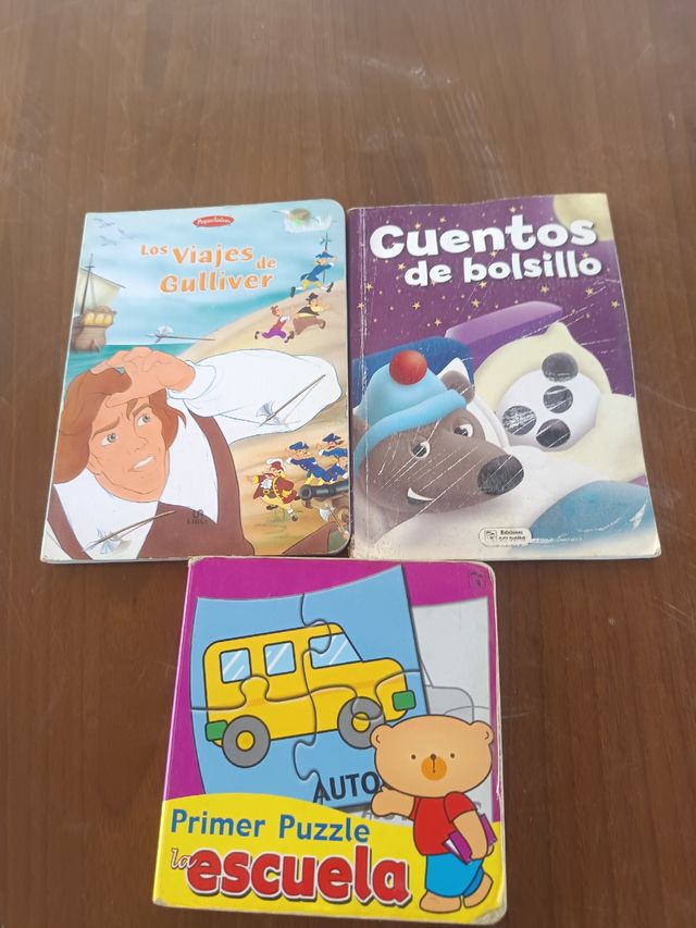Lote de dos libros infantiles y un puzzle. - Libro Los Viajes de Gulliver. - Libro Cuentos de bolsillo. - Puzzle Primer Puzzle la Escuela con coche y oso.