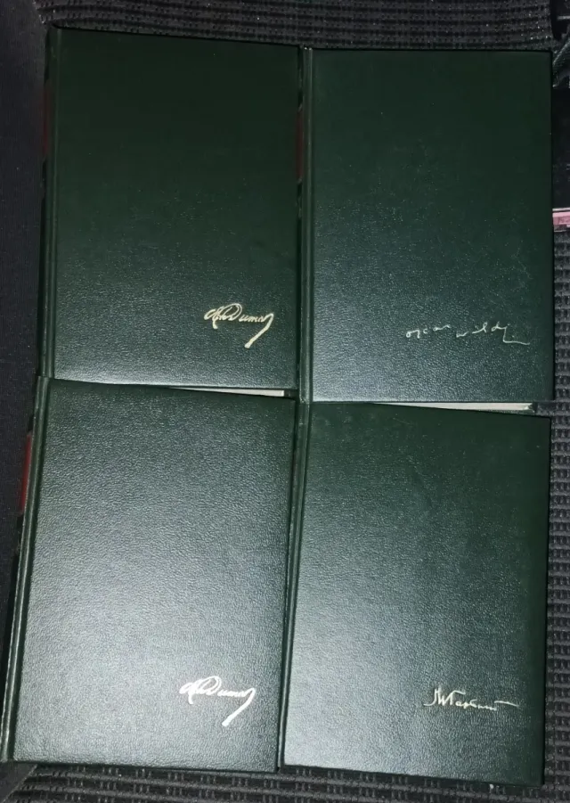 Detalles del productoConjunto de cuatro libros con tapas de color verde oscuro y detalles dorados.