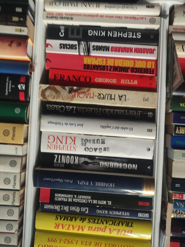 Detalles del productoLote de libros usados en buen estado. Algunos títulos incluyen: 'Los Ojos del Dragón', 'Un saco de huesos', 'Hombre y Papa', 'Nocturno', 'La mujer Maquis', 'Franco', 'Lo que queda de España', entre otros. - Se venden 12 libros en total. - Perfectos para amantes de la lectura. - Algunos muestran leves señales de uso.