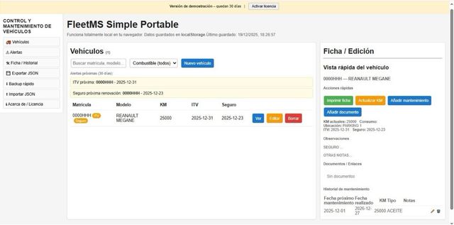 Licencia para el software FleetMS Simple Portable, una herramienta para el control y mantenimiento de vehículos.