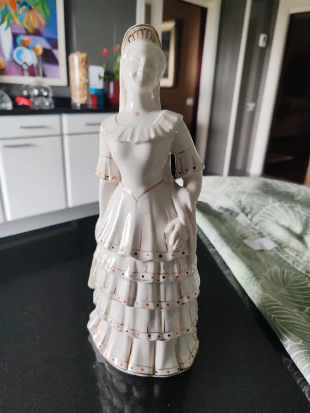 Detalles del productoBonita licorera de porcelana con forma de mujer vestida con traje de época.