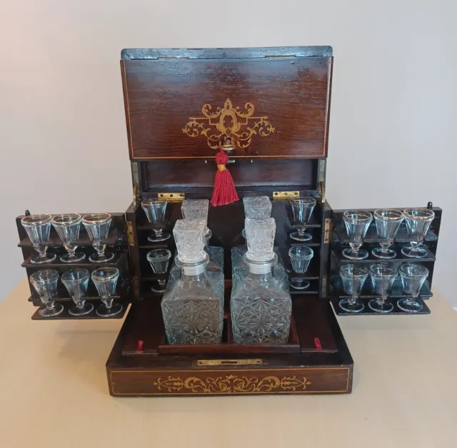 Detalles del productoAntigua licorera francesa tipo Cave à Liqueur del periodo Napoleón III (circa 1860-1880), concebida para el servicio de licores y puros en salones burgueses del siglo XIX.