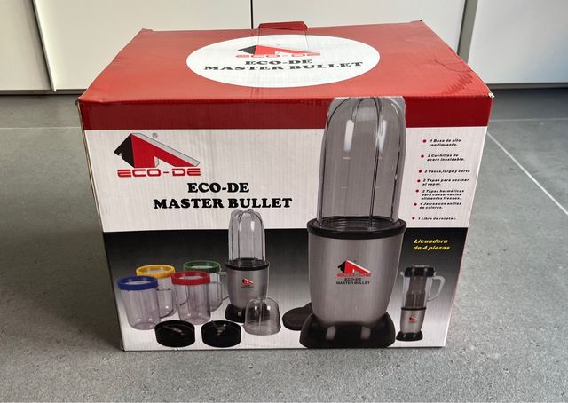 Detalles del productoLicuadora ECO-DE Master Bullet en color plateado y negro. Incluye varios accesorios para preparar tus batidos y recetas.