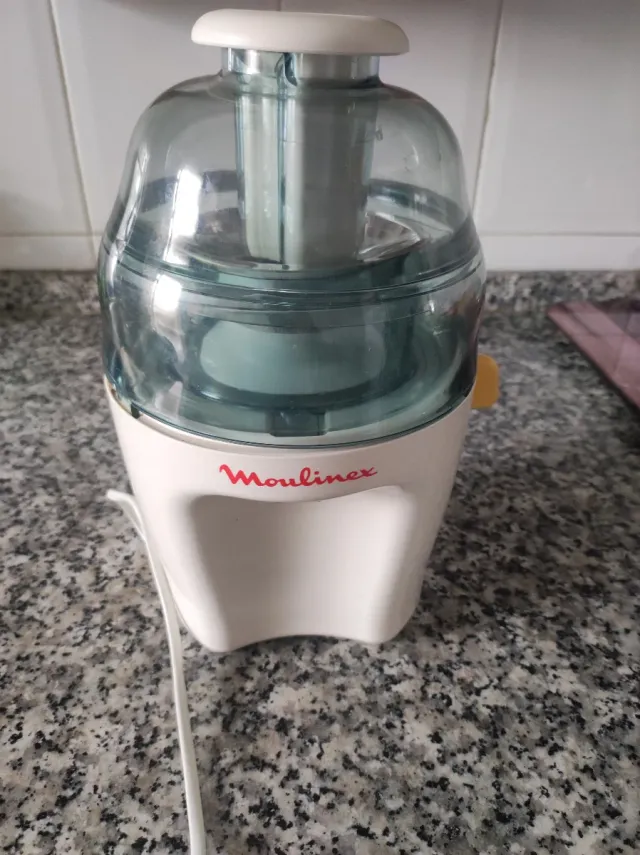 Licuadora de la marca Moulinex. - Diseño moderno en color blanco y gris. - Tapa transparente. - Asa lateral amarilla.